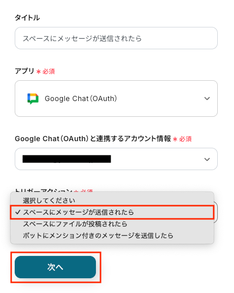 トリガーアクション:「スペースにメッセージが送信されたら」を選択