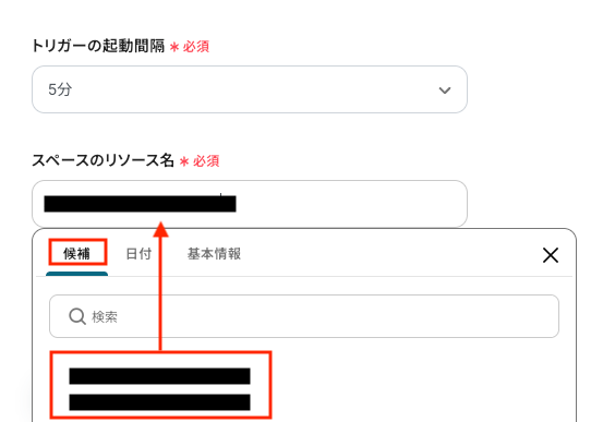 「トリガーの起動間隔」を確認し、「スペースのリソース名」を候補から選択します。 トリガーの起動タイミングは、5分、10分、15分、30分、60分のいずれかで設定できます。
