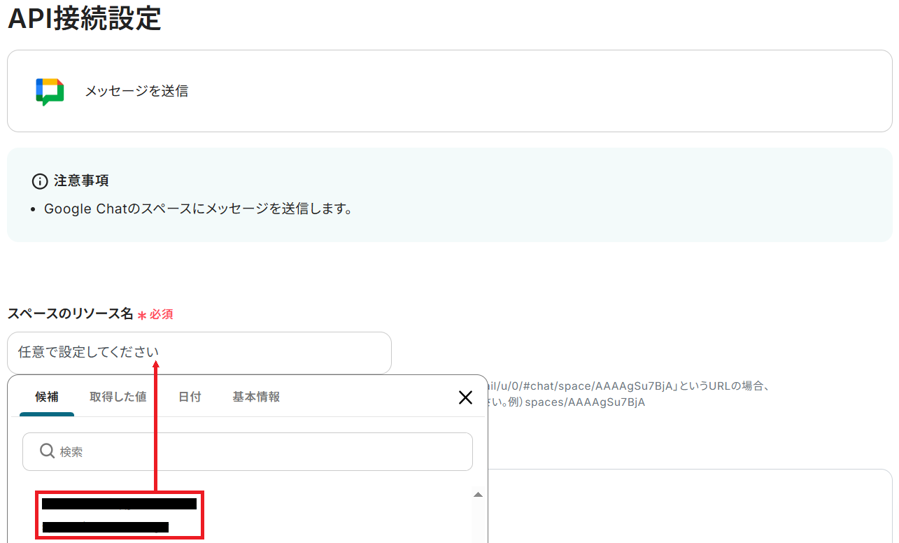 API接続設定に移るので、まずスペースのリソース名を候補から選択してください。