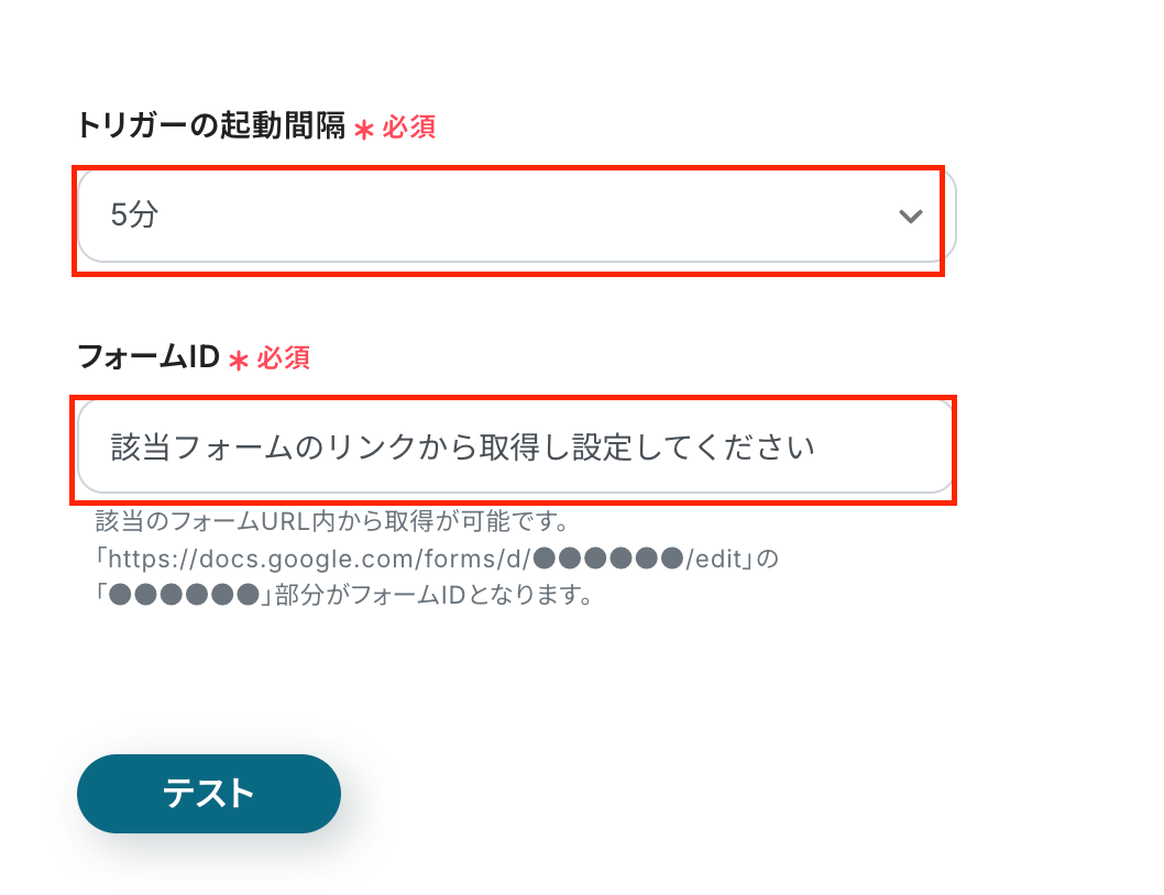 フォームIDはGoogleフォームのURLから取得してください。Googleフォームに回答を送信してある方は、そのまま「テスト」をクリックしましょう。