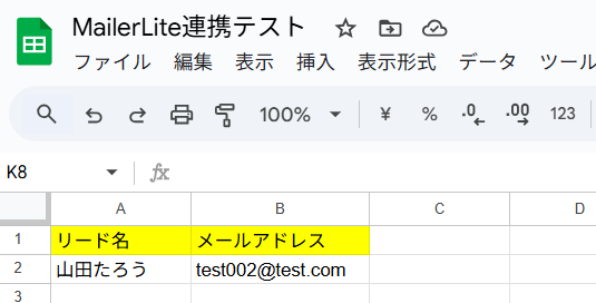 もし、MailerLiteと連携するGoogle スプレッドシートをまだ作成していない場合は、ここで新たに作成してください。 下記画像を参考に、MailerLiteに連携したいリード情報のヘッダーを追加し、テスト用の値を入力しましょう。 フローボット設定後、ヘッダーの下にリード情報を追加すると、自動的にMailerLiteにデータが連携されるようになります。