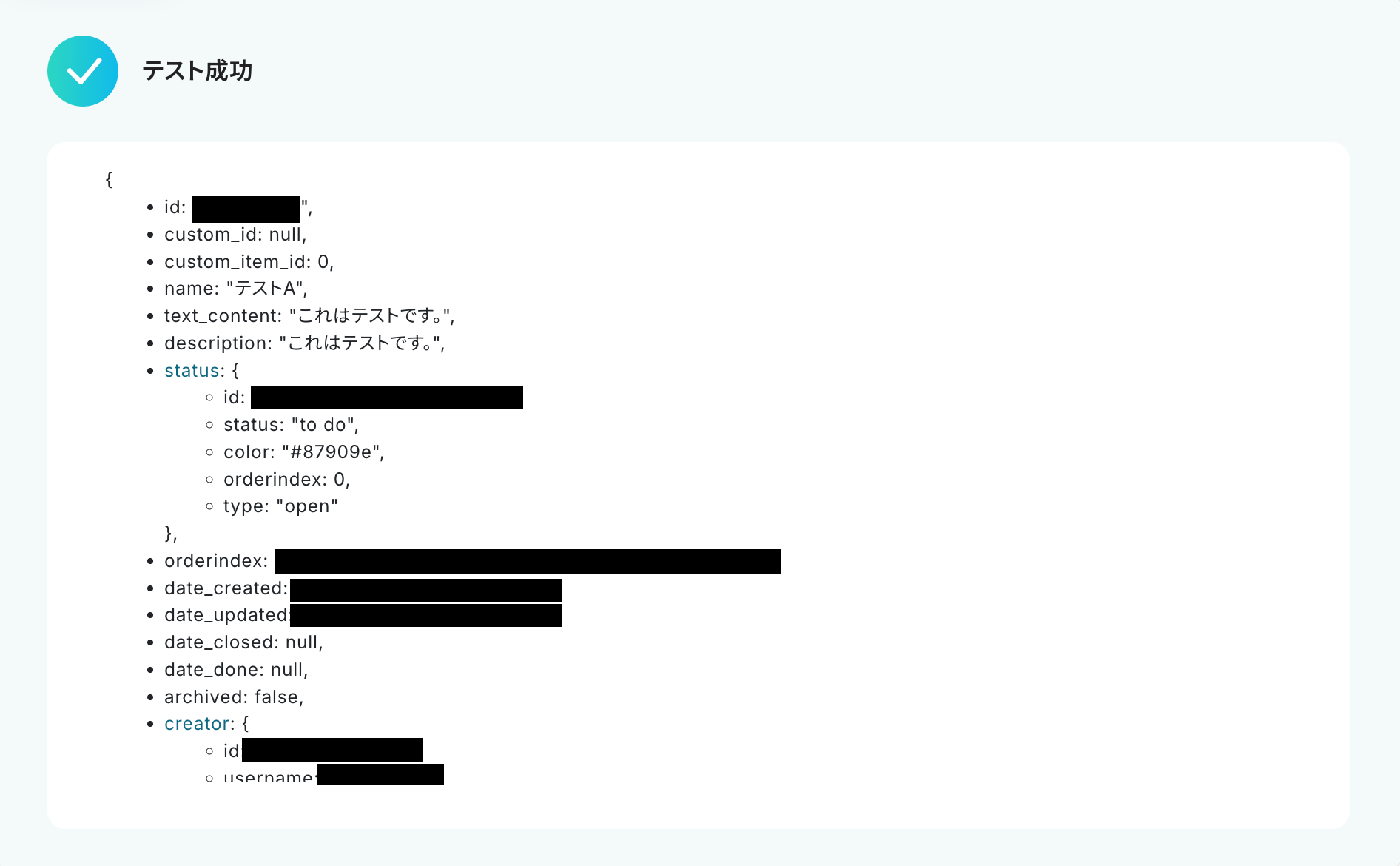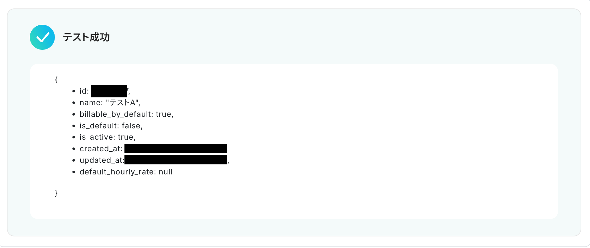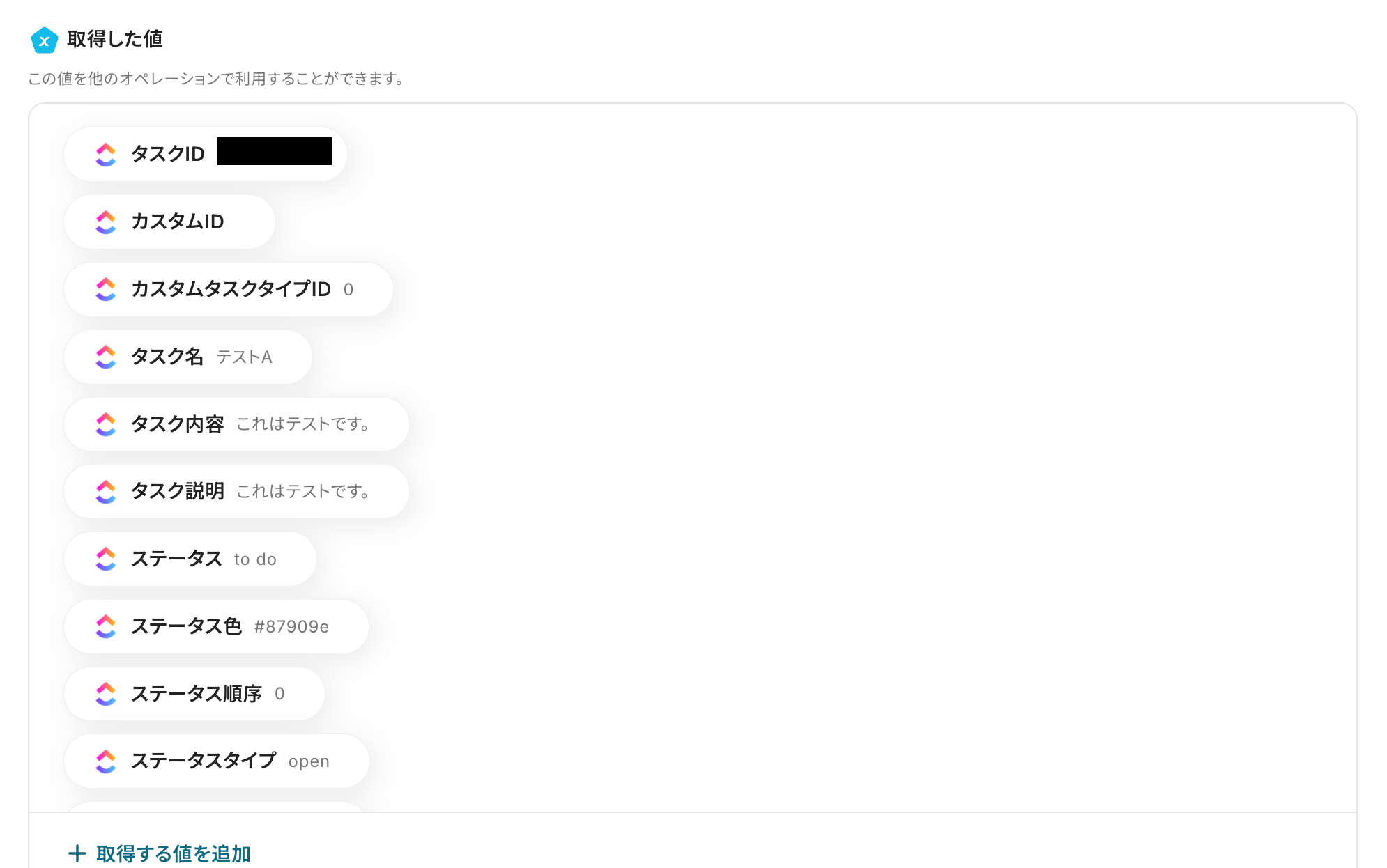 「テスト成功」と表示が出たら、アウトプット(取得した値)が取得されます。