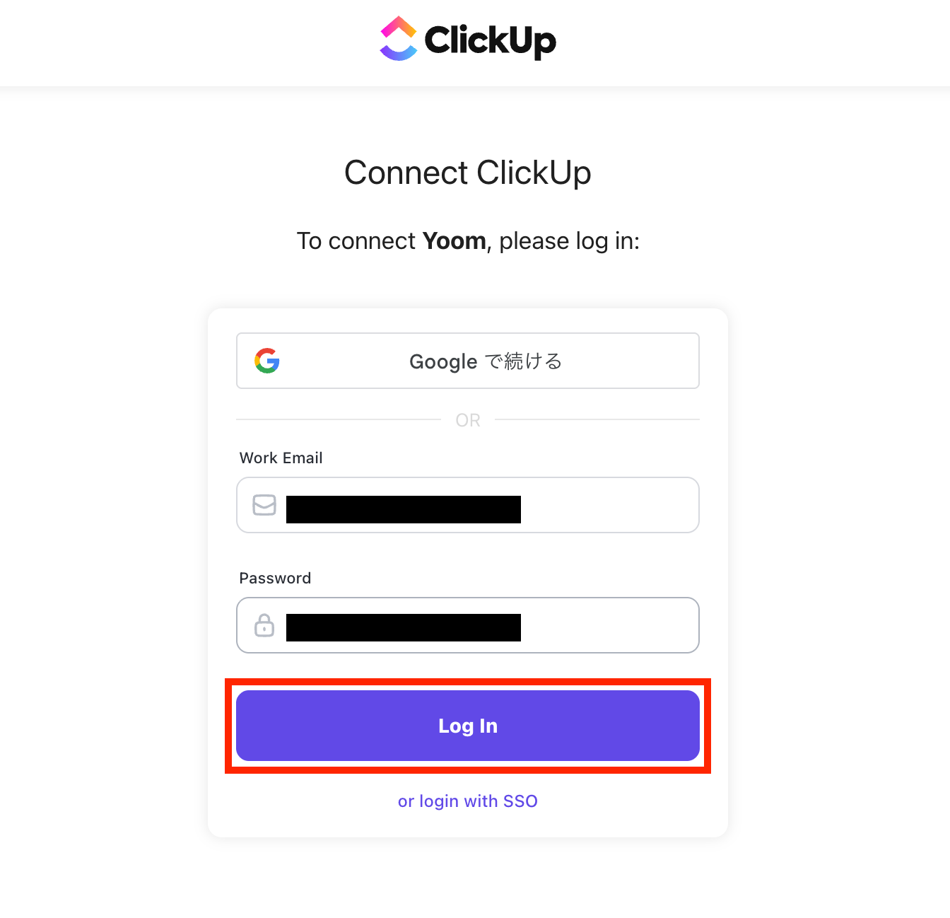 ClickUpのログイン画面が表示されますので、メールアドレスとパスワードを入力して「Log In」ボタンを押します。