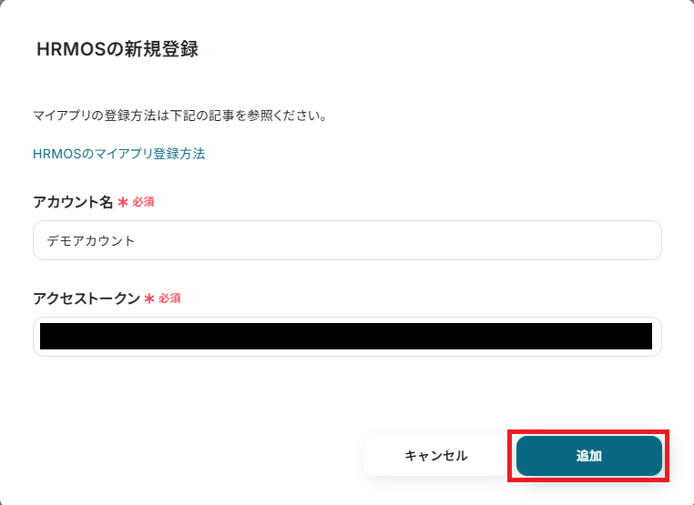「アカウント名」と「アクセストークン」を入力し、最後に追加をクリックしましょう。