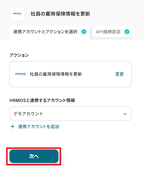 - 最後に、オペレーションでHRMOSを選択し、「社員の雇用保険情報を更新」のアクションを設定します。ここで、トリガーで取得したスプレッドシートの情報を紐付けます