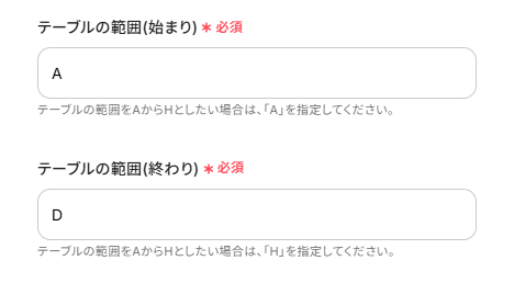「テーブルの範囲(始まり)」「テーブルの範囲(終わり)」:注釈を確認しながら、テーブルの範囲の開始地点と終了地点を入力してください。