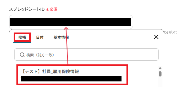 「スプレッドシートID」「シートID」:入力欄をクリックすると候補が表示されるので、作成したGoogle スプレッドシートを選択しましょう。