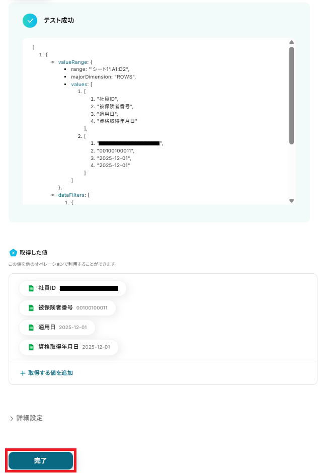 以上が、Google スプレッドシートで行が更新されたら、HRMOSで雇用保険情報を更新するフローの連携手順になります!
