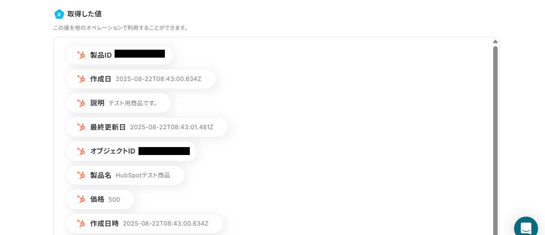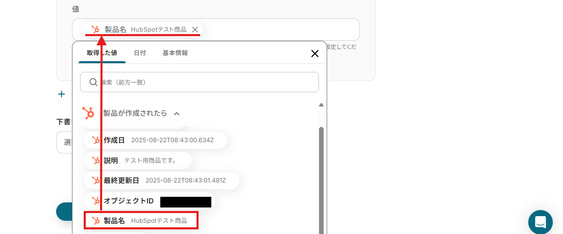 下記画像のように設定すると、ステップ3で取得したアウトプットを活用し、HubSpotに登録した「製品名」を自動で登録することができますよ!