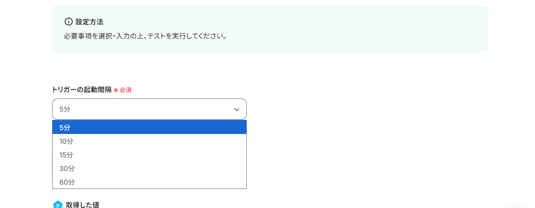 トリガーの起動間隔は、5分、10分、15分、30分、60分の間隔から選択できます。