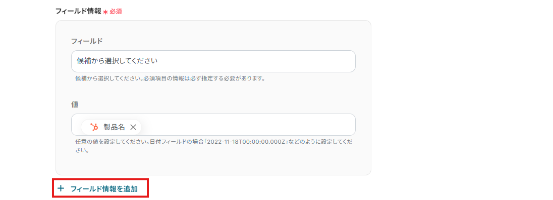 値には、設定したフィールドに自動登録したいHubSpotのデータを入力します。