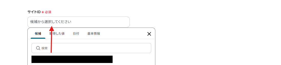 サイトIDとコレクションIDは、枠内をクリックし表示された候補から選択します。