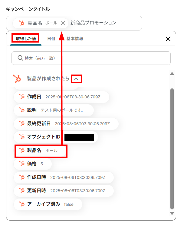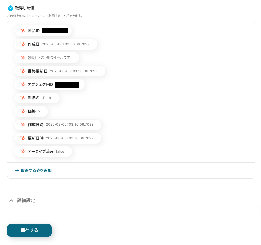 テストが成功すると、取得した値にHubSpotの製品情報が取得されるので、内容を確認したら保存してください。