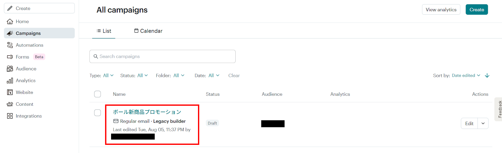 テストが成功すると、キャンペーンが作成されるので確認してください。