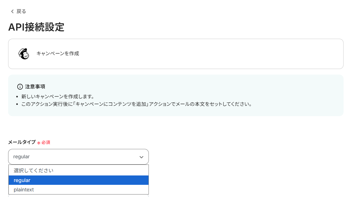 続いて、HubSpotから取得した値を利用して、Mailchimpにキャンペーンを作成する設定を行います。