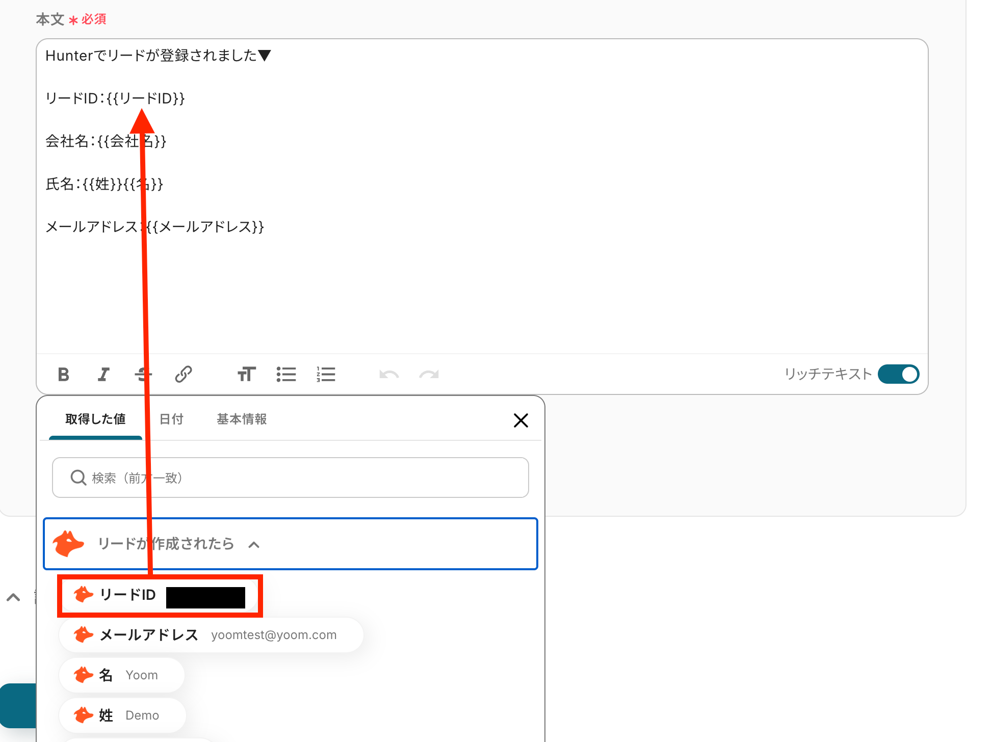 これにより、Hunterのリードごとに変わる情報をメール本文へ動的に反映できます。