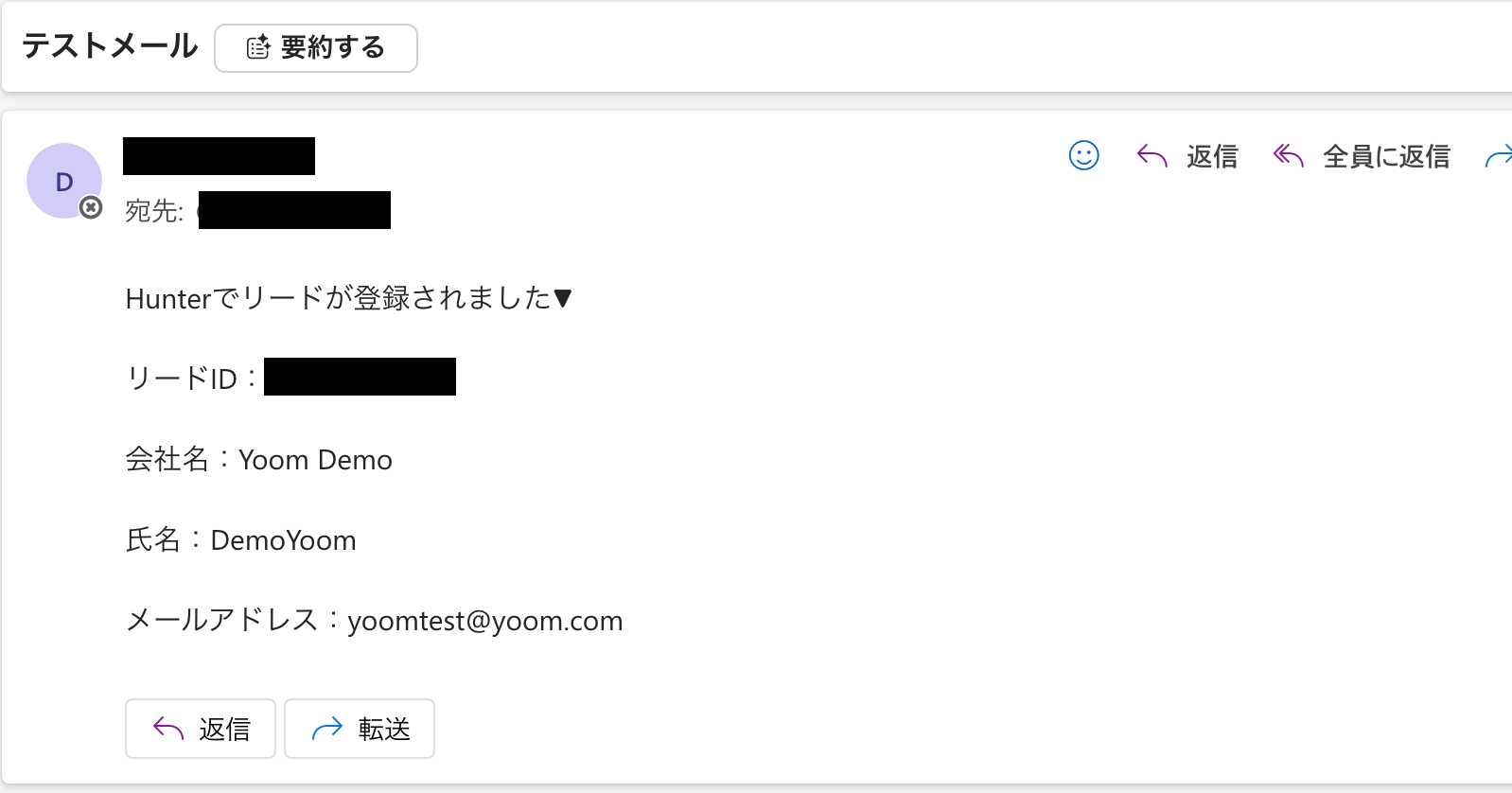 Hunterでのリード登録を知らせるメールが送信されているはずです!