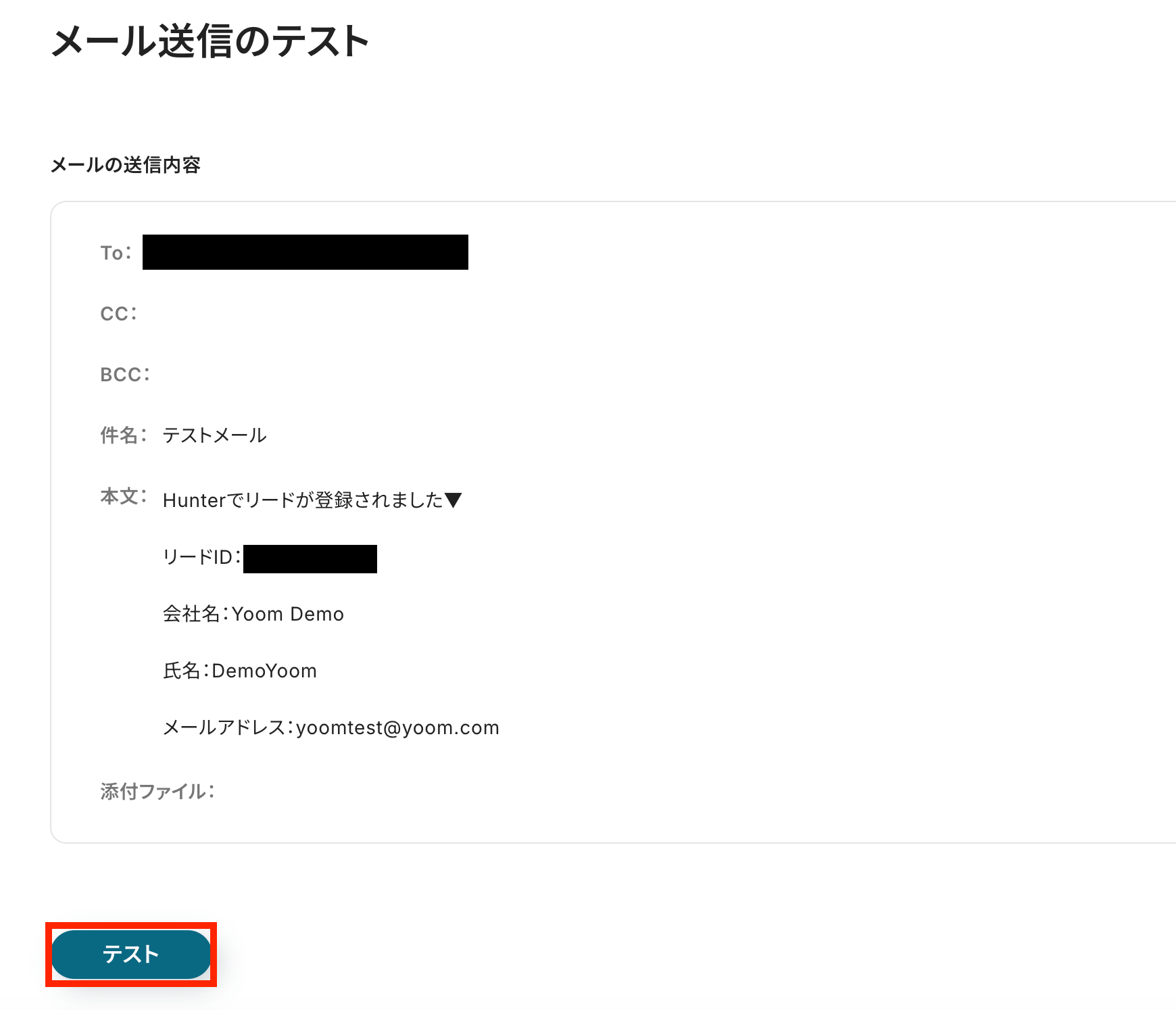 メール内容に問題がないか確認が終わったら「テスト」ボタンをクリックしましょう。