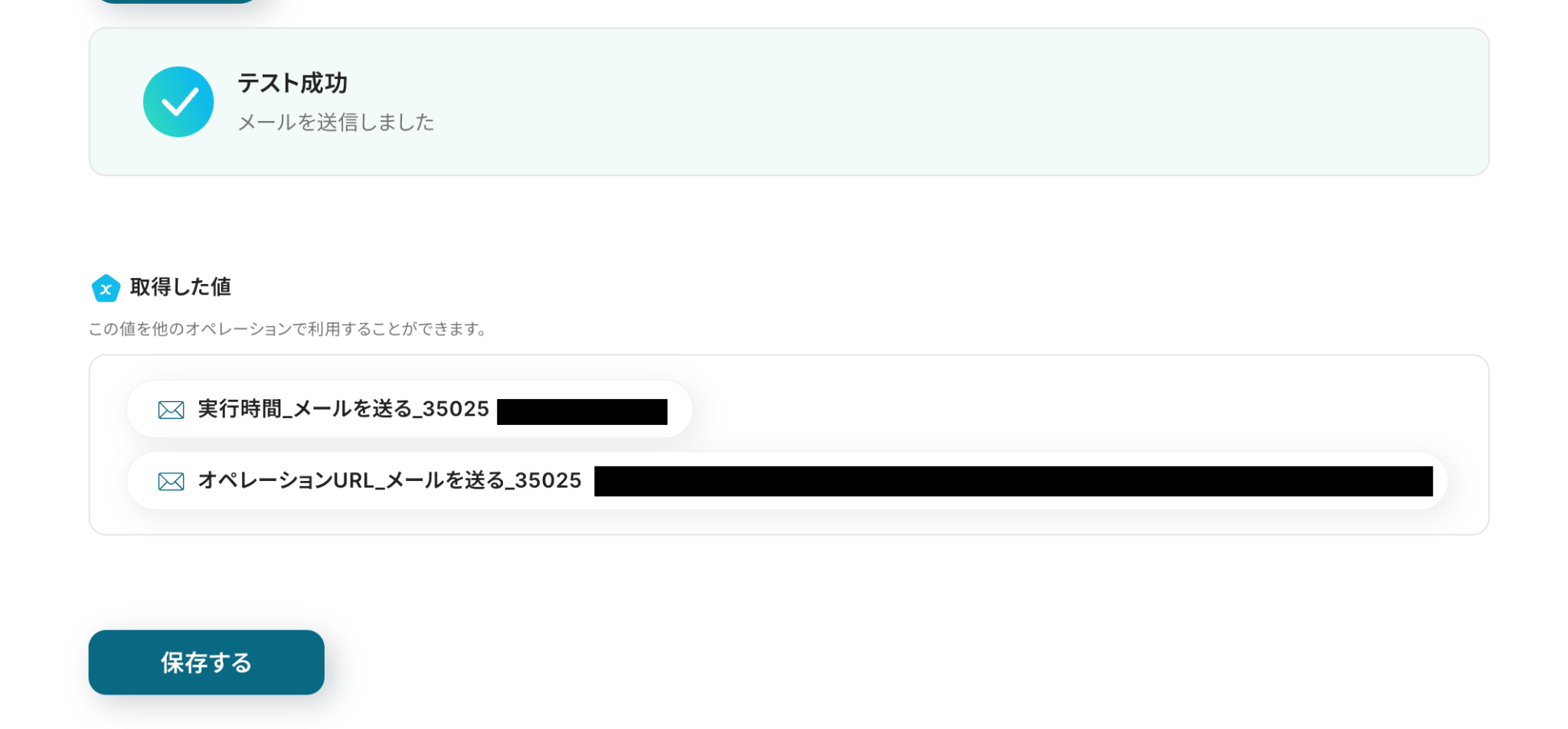 「テスト成功」と表示が出たら、「取得した値」が取得されます。