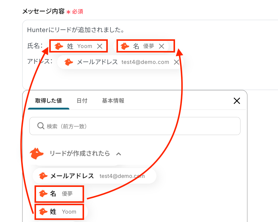 アクセストークン:Yoomと連携するHunterアカウントから値を取得して入力します。