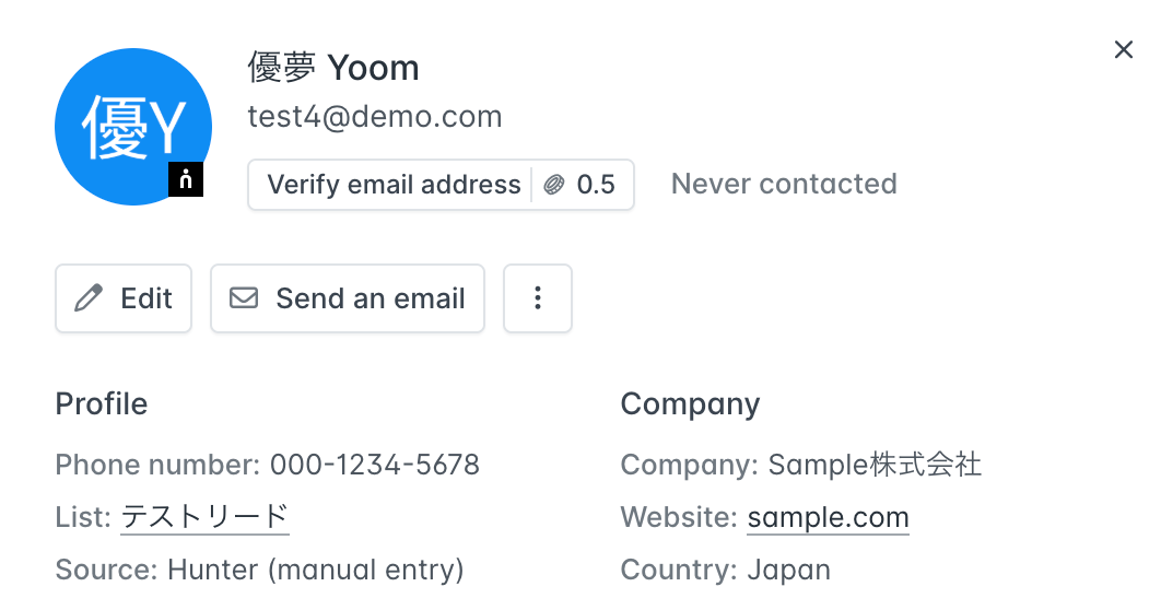設定が完了したら動作チェックのためにテストを行いますので、フローで使用するHunterの画面に移り、テスト用のリードを作成してください。