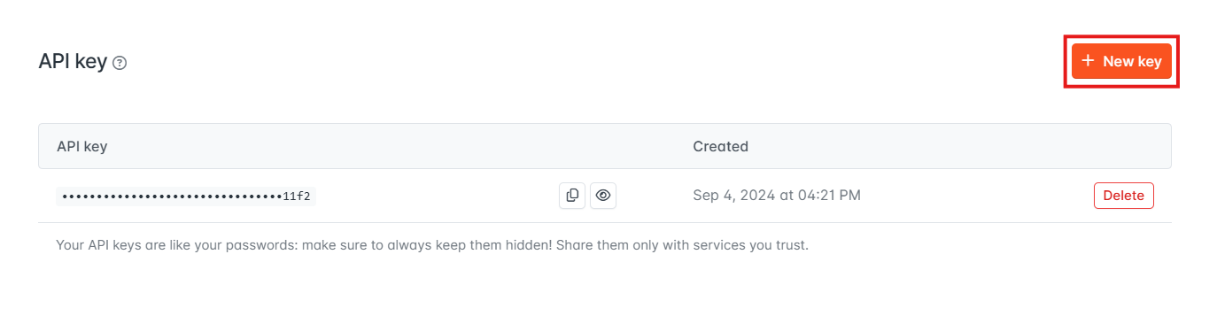 次に、画面右側に表示される「+New key」を選択しましょう。