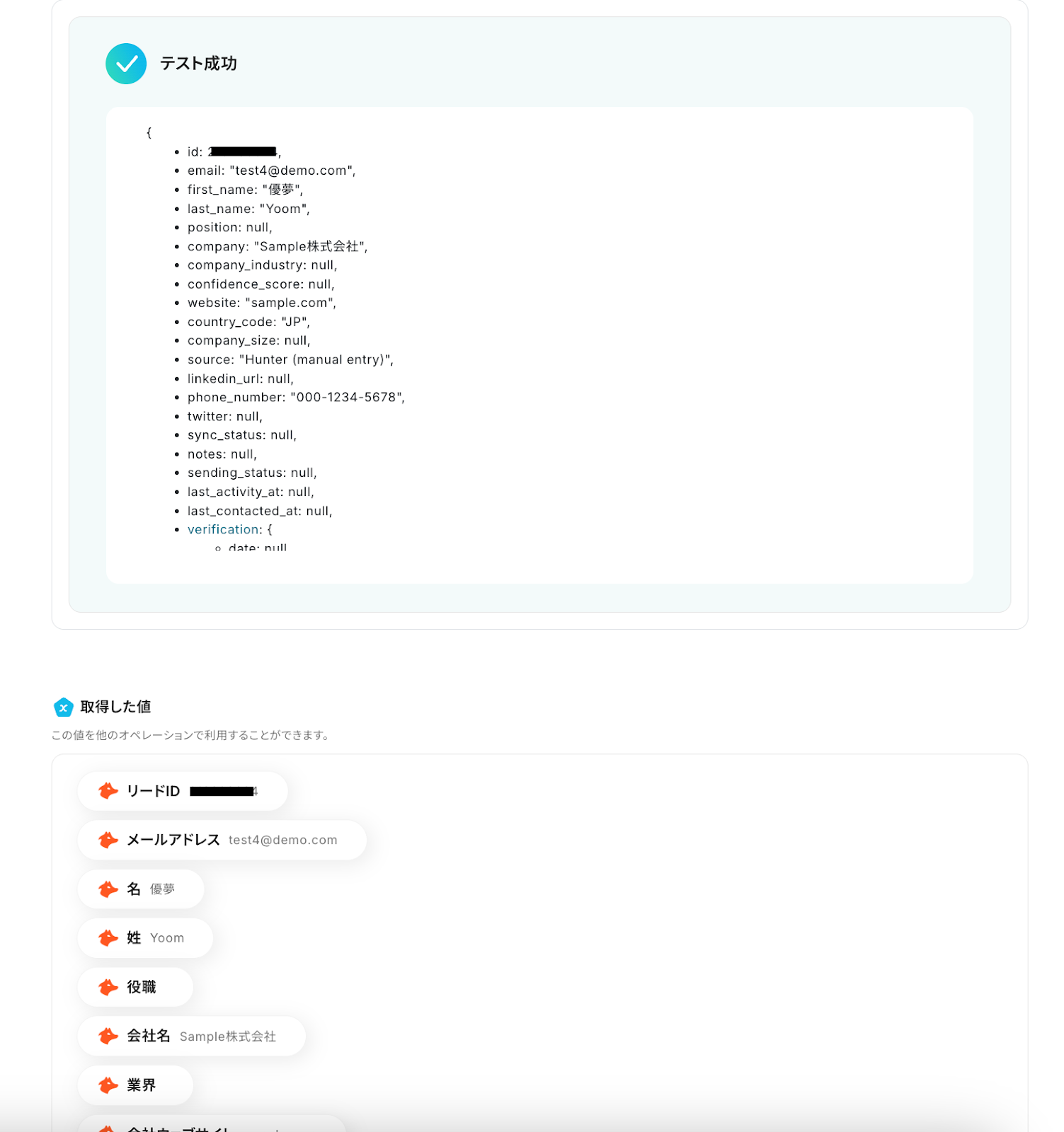 テストが成功すると、先ほど作成したリードの情報が「取得した値」として抽出されるので、内容を確認してください。