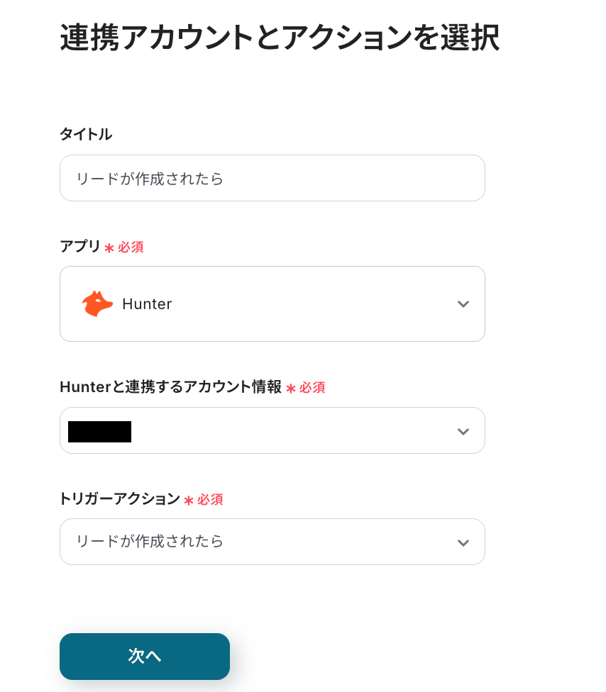 まずは、Hunterでリードが作成された際に、フローが起動するように設定していきます。