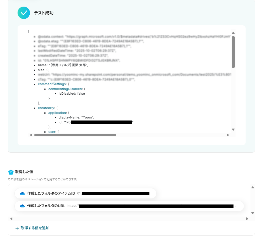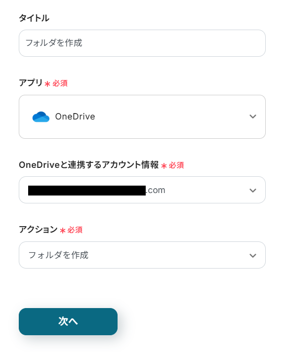 - 最後に、OneDriveの「フォルダを作成」アクションを設定し、Notionから取得した情報をもとにフォルダを作成します