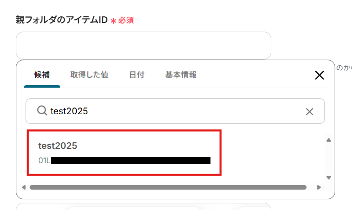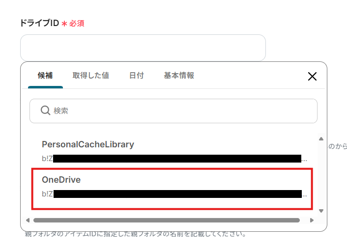 - OneDriveでフォルダを作成するオペレーションでは、作成したフォルダを格納する親フォルダを任意で設定することが可能です。案件ごとや年月ごとなど、管理体系に合わせて保存先を指定してください。