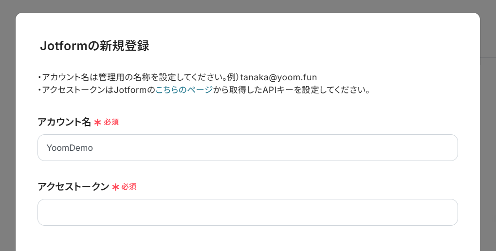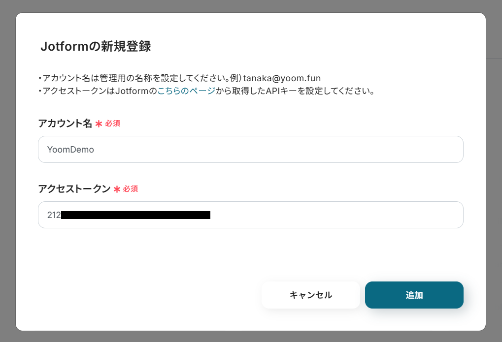 これをコピーして、Yoomのアプリ登録画面の「アクセストークン」に設定してください。