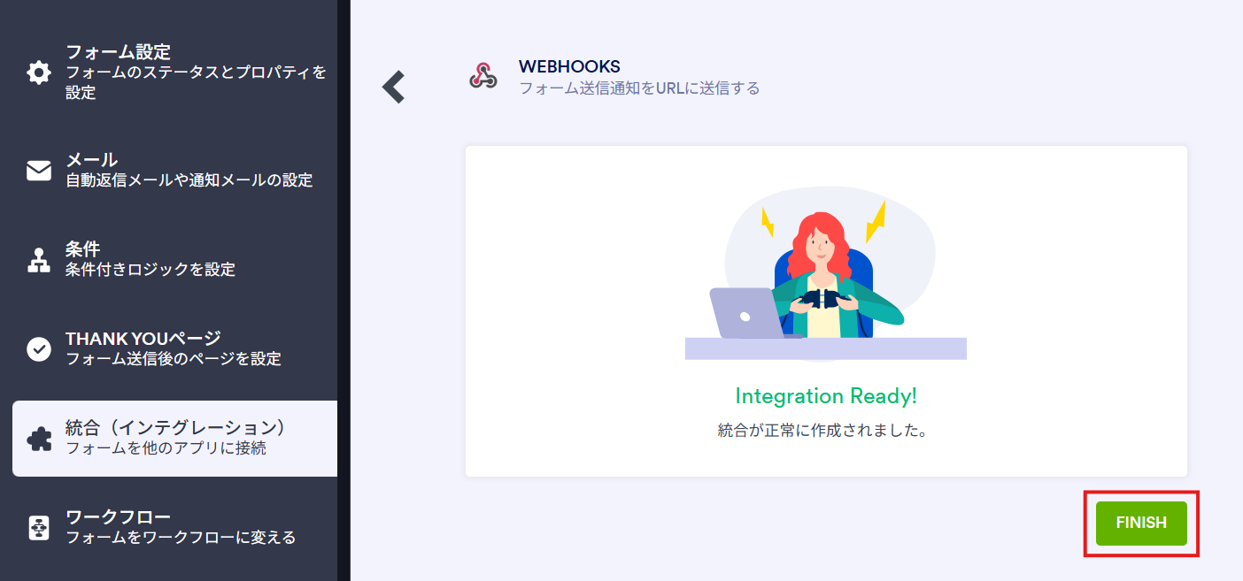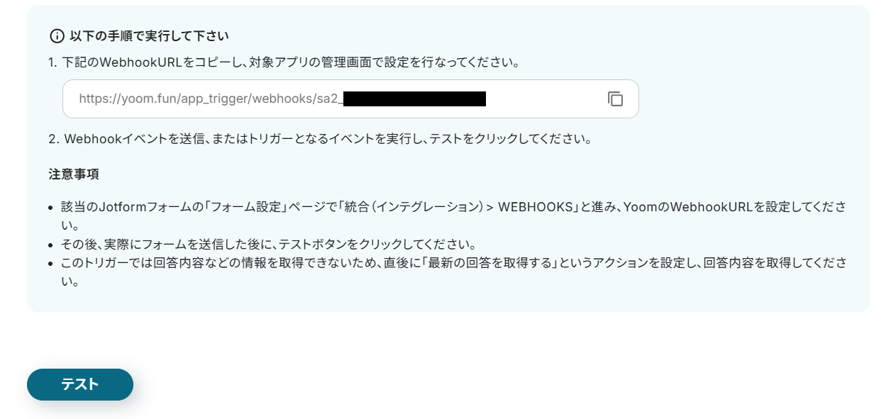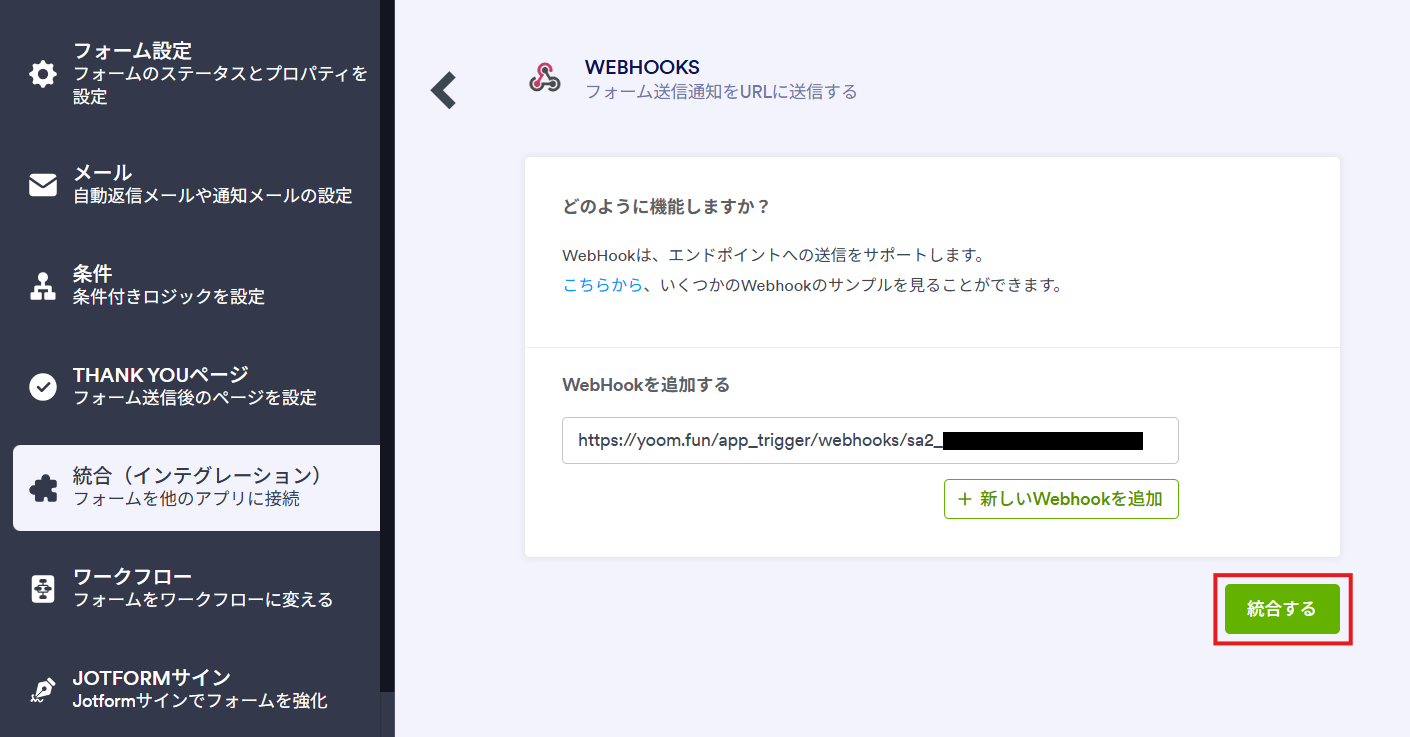 - JotformのWebhook設定方法はこちらをご参照ください。