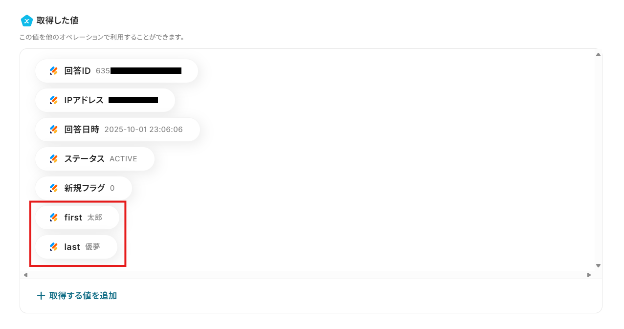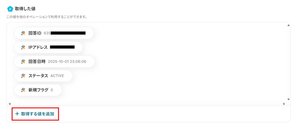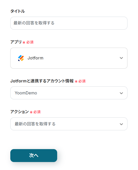 - 続いて、オペレーションでJotformの「最新の回答を取得する」アクションを設定し、フォームの回答内容を取得します