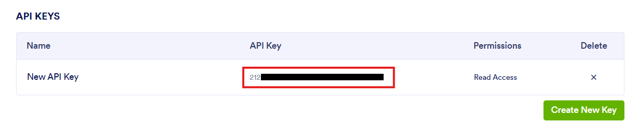 - 「Create New Key」をクリックすると、APIキーが生成されます。