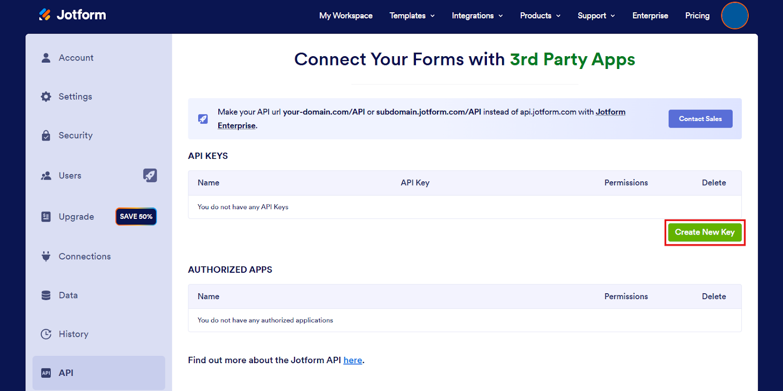 - アクセストークンを取得するために、JotformのAPI設定画面にアクセスしましょう。