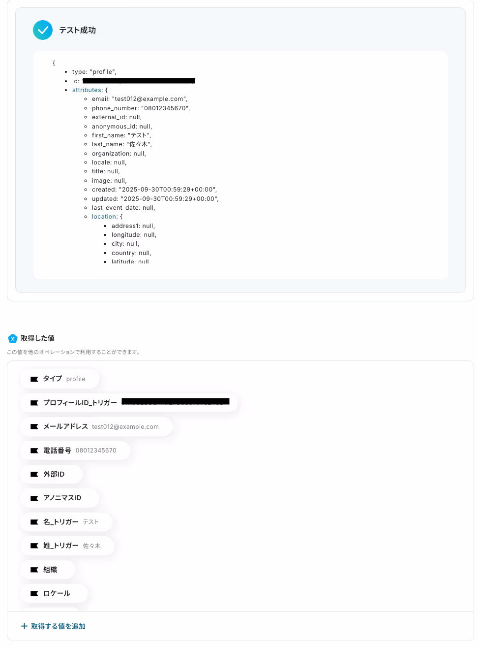 テストに成功すると、Klaviyoに作成されたプロフィールに関する情報が一覧で表示されます。