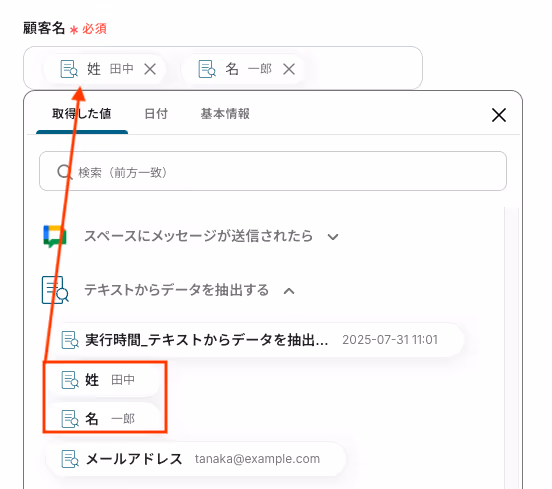 こちらも顧客名と同様に、入力欄をクリックすると取得した値が表示されるので選択して入力が可能です。