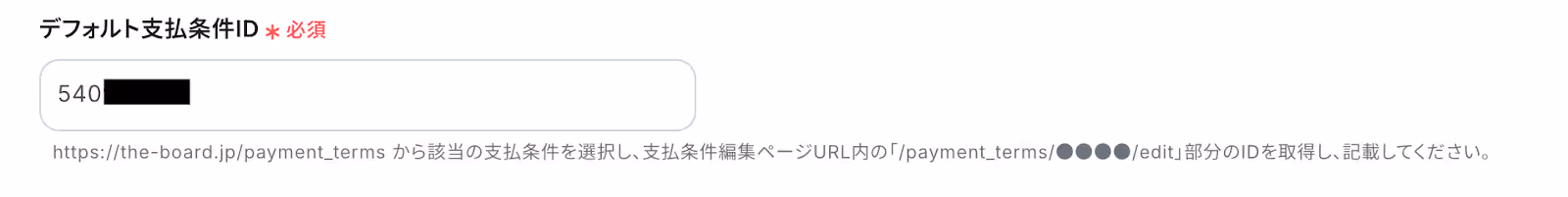 支払条件編集ページURL内の「/payment_terms/●●●●/edit」部分のIDをコピーし、入力してください。