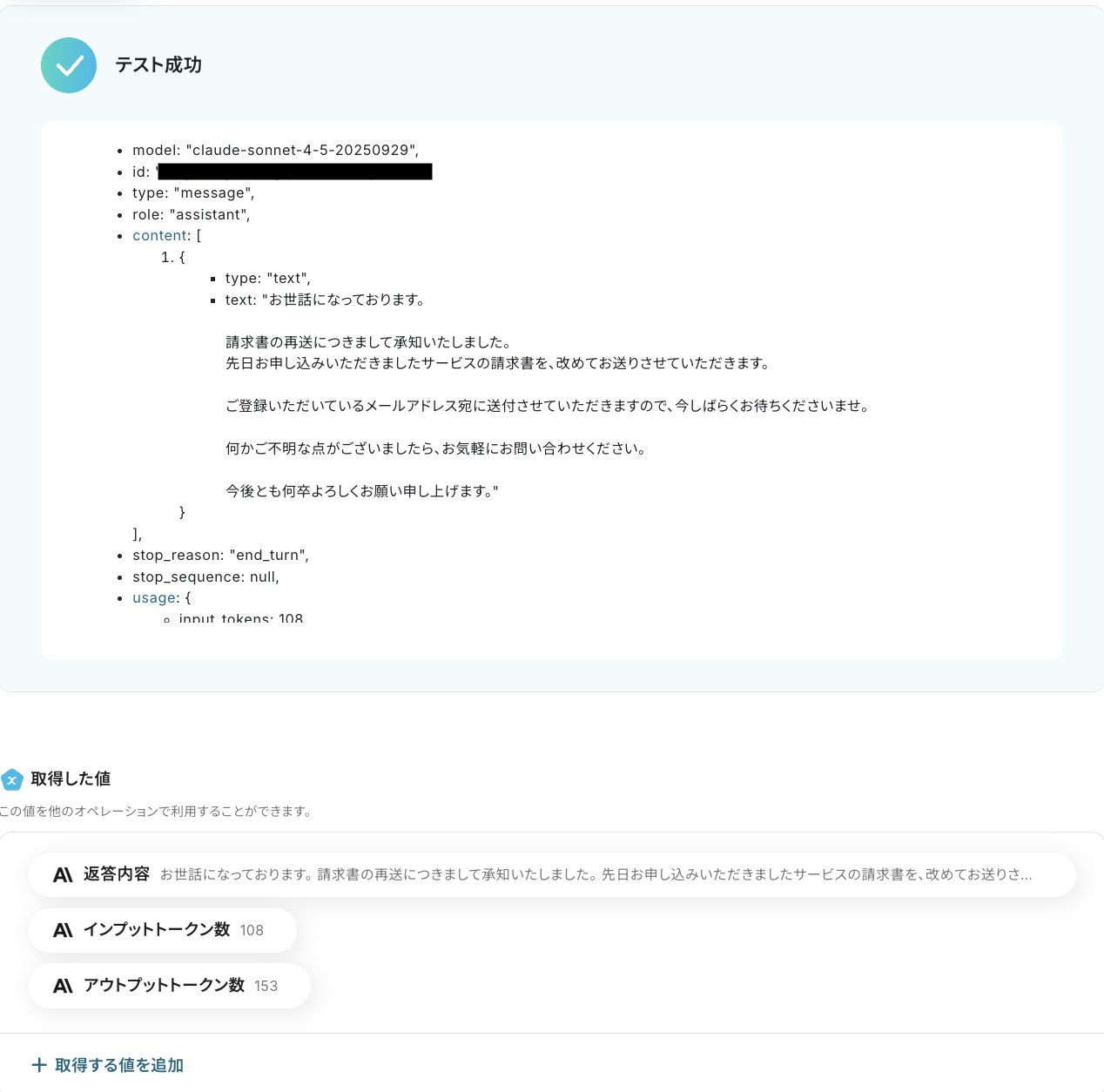 テストに成功すると、生成されたテキストに関する情報が一覧で表示されます。
