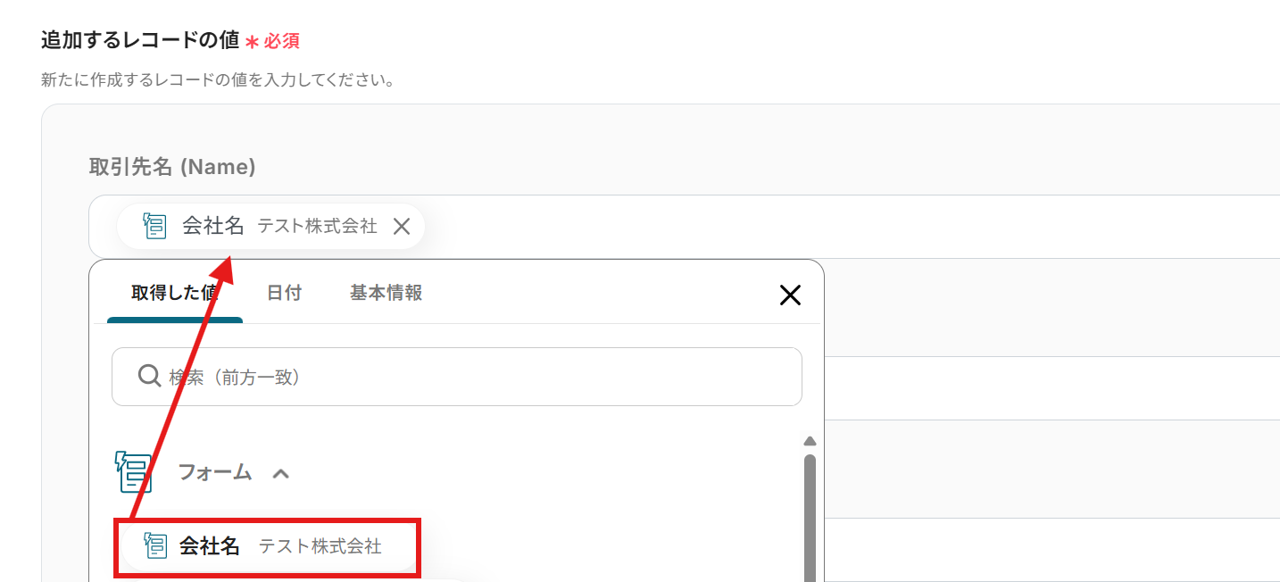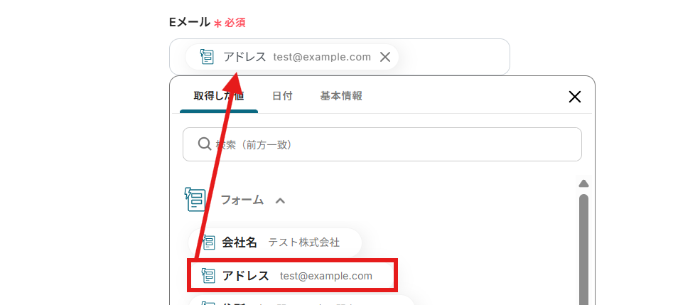 各項目は入力欄をクリックすると、フォームで取得した値を引用できます。