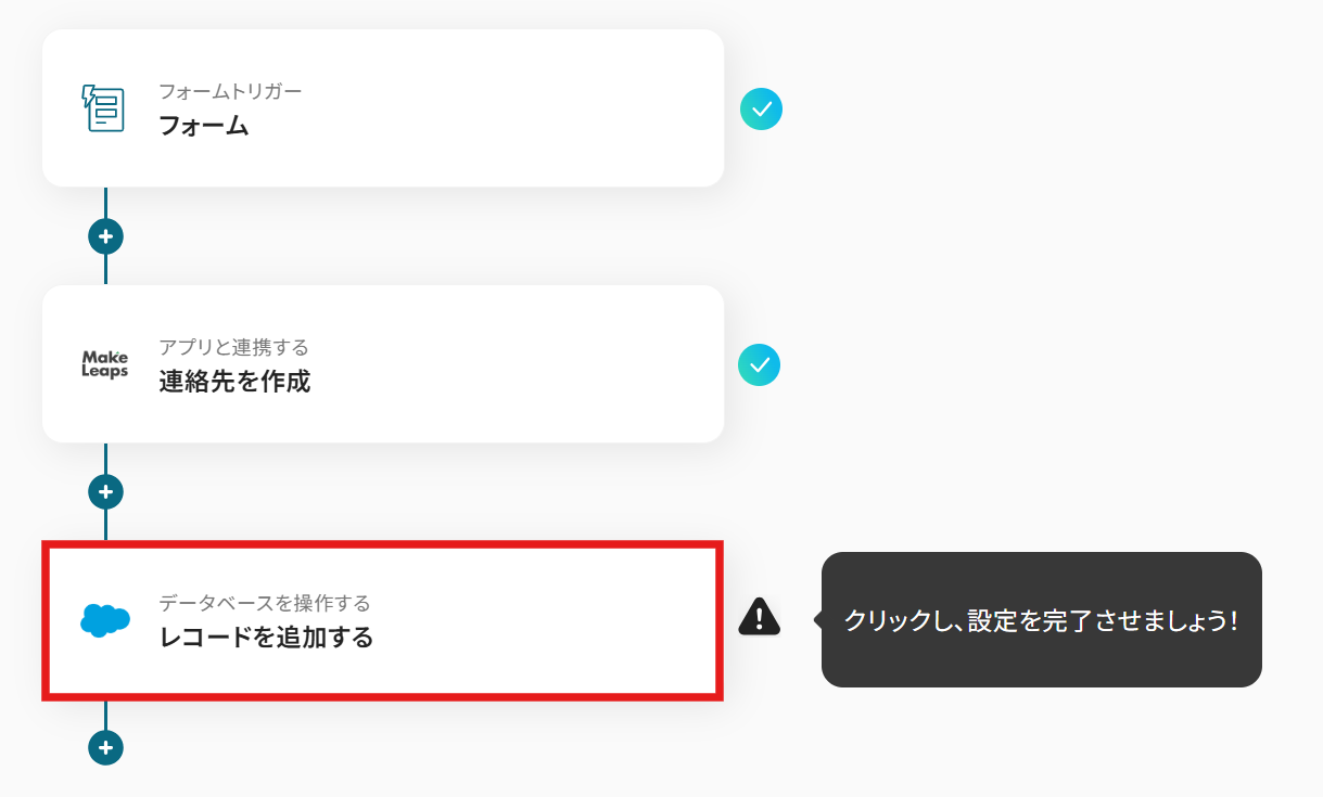 「Salesforceで特定条件に合うリードが追加されたら、MakeLeapsにも追加する」ワークフローは、リード情報の登録作業を簡素化します。