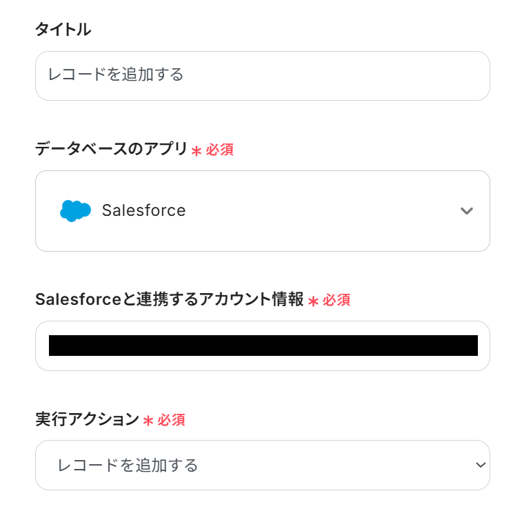Salesforceと連携するアカウント情報はプルダウンから選択します。基本的にはマイアプリ登録したアカウントが設定されています。