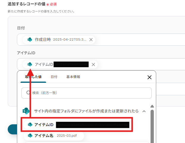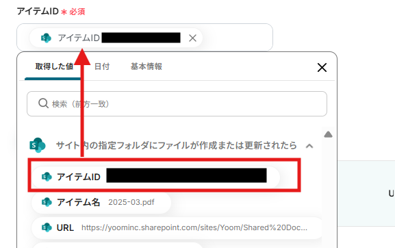 3) サイトIDとドライブIDを入力します。 先ほどと同様に候補から選択してください。 アイテムIDは取得した値(アウトプット)を使用して入力してください。アウトプットについて | Yoomヘルプセンター