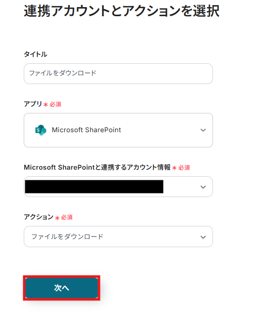 2) アクションは「ファイルをダウンロード」を選択して、「次へ」をクリックします。