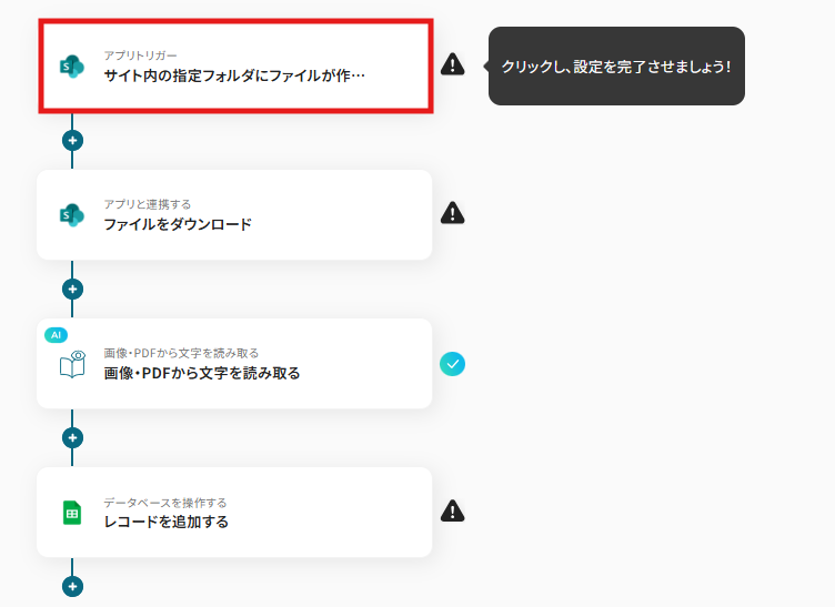 Microsoft SharePointのトリガー設定とOCR、Google スプレッドシートのアクション設定