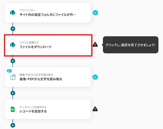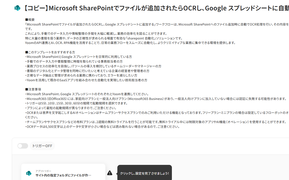 ■概要 「Microsoft SharePointでファイルが追加されたらOCRし、Google スプレッドシートに追加する」ワークフローは、Microsoft SharePointへのファイル追加時に自動でOCR処理を行い、その内容をGoogle スプレッドシートに転記する仕組みです。 これにより、手動でのデータ入力や情報整理の手間を大幅に軽減し、業務の効率化を図ることができます。 特に大量の書類を扱う業務や、データの正確性が求められる場面で有効な「sharepoint 自動化」ソリューションです。 YoomのAPI連携とAI、OCR、RPA機能を活用することで、日常の業務フローをスムーズに自動化し、よりクリエイティブな業務に集中できる環境を提供します。 ■このテンプレートをおすすめする方 ・Microsoft SharePointとGoogle スプレッドシートを日常的に利用している方 ・手動でのデータ入力や書類整理に時間を取られている事務担当者の方 ・業務プロセスの効率化を目指し、ITツールの導入を検討しているチームリーダーやマネージャーの方 ・書類のデジタル化とデータ管理を同時に行いたいと考えている企業の経営者や管理者の方 ・正確なデータ抽出と管理が求められる業務に携わっており、エラーを減らしたい方 ・Yoomを活用して既存のSaaSアプリを組み合わせた自動化を実現したい技術担当者の方 ■注意事項 ・Microsoft SharePoint、Google スプレッドシートのそれぞれとYoomを連携してください。 ・Microsoft365(旧Office365)には、家庭向けプランと一般法人向けプラン(Microsoft365 Business)があり、一般法人向けプランに加入していない場合には認証に失敗する可能性があります。 ・トリガーは5分、10分、15分、30分、60分の間隔で起動間隔を選択できます。 ・プランによって最短の起動間隔が異なりますので、ご注意ください。 ・OCRまたは音声を文字起こしするAIオペレーションはチームプラン・サクセスプランでのみご利用いただける機能となっております。フリープラン・ミニプランの場合は設定しているフローボットのオペレーションはエラーとなりますので、ご注意ください。 ・チームプランやサクセスプランなどの有料プランは、2週間の無料トライアルを行うことが可能です。無料トライアル中には制限対象のアプリやAI機能(オペレーション)を使用することができます。 ・OCRデータは6,500文字以上のデータや文字が小さい場合などは読み取れない場合があるので、ご注意ください。