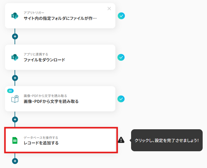 これで【Microsoft SharePointでファイルが追加されたらOCRし、Google スプレッドシートに自動で追加する 】というフローが完成しました。