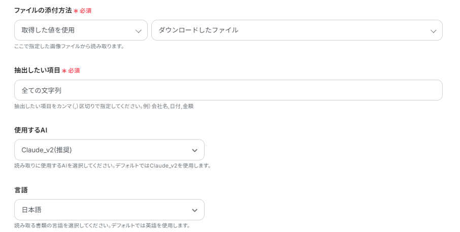 3) 必須事項を入力します。 ファイルの添付方法は「取得した値を使用」「ダウンロードしたファイル」を選択し、抽出したい項目が「すべての文字列」となっていることを確認します。 また、使用するAIや言語は必要に応じて選択してください。
