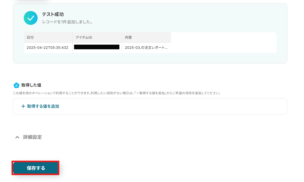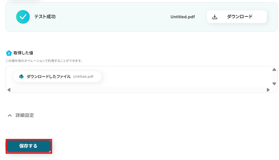 入力が完了したら、「テスト」をクリック。 テストが完了したら、「保存」します。 ※ダウンロードできるファイルの容量は最大300MBです。ただし、アプリの仕様によっては300MB未満になることがあるので、ご注意ください。 ※その他トリガーや各オペレーションで扱えるファイル容量の詳細については、以下もチェックしてみてください。 https://intercom.help/yoom/ja/articles/9413924