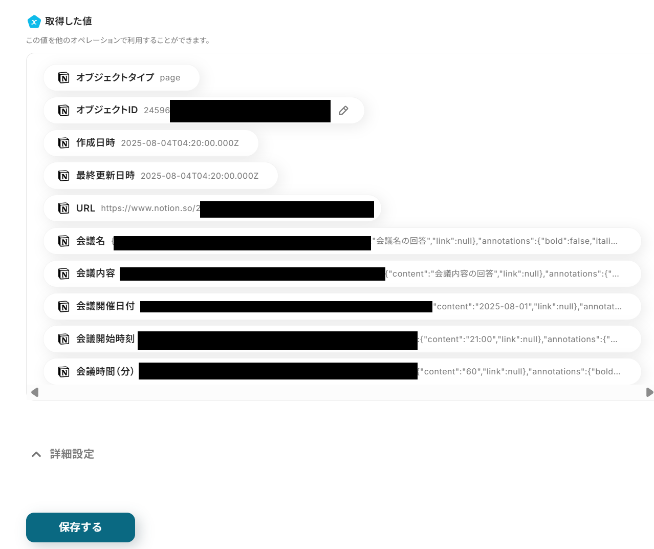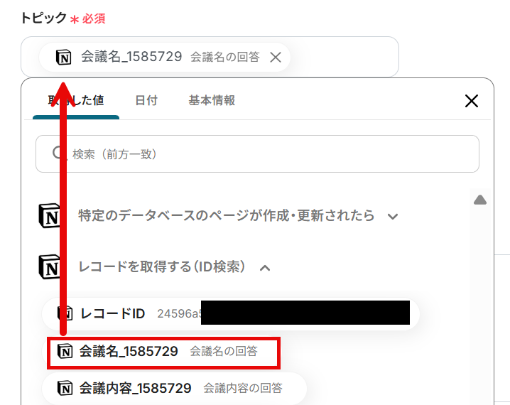 なお、取得した値に、「会議名」「会議内容」「会議開催日付」「会議開始時刻」「会議時間(分)」が反映されない場合があります。